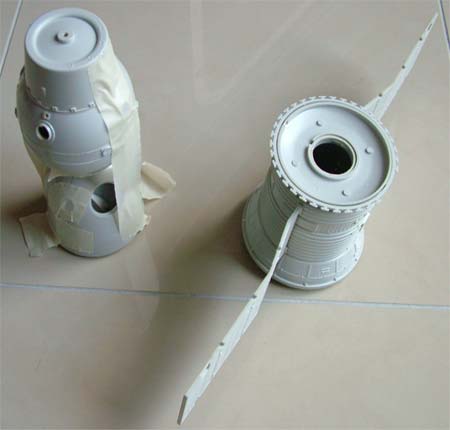 Ein erstaunlich detailreiches Modell aus der russischen Modellfirma Ogonjek. Gibts nur noch selten, ich hatte das Glück, gleich 2 davon zu bekommen, ein Modell halb zusammengebaut, das andere ungebaut, aber fast alles aus den Giessästen rausgenommen. Ich werde das eine Modell möglicherweise zum Saljut-1 - Sojus-11 Gespann verbauen (wobei Saljut dann komplett selbstgebaut werden müßte), das andere Sojusmodell wird auf jeden Fall mit dem 1/32-Monogram-Apollo-Modell zum Apollo-Sojus-Testprojekt (ASTP) verbaut.
