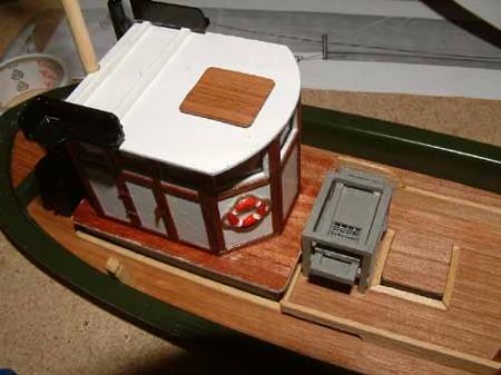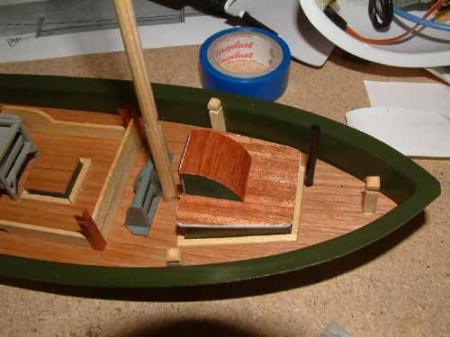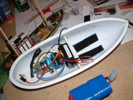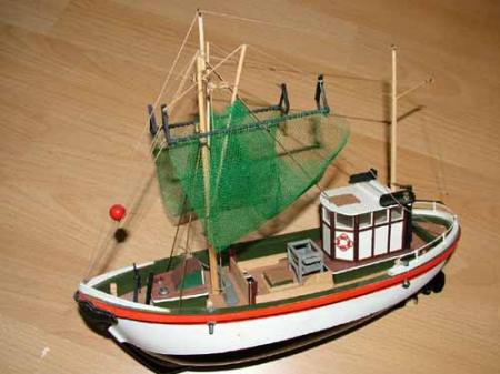 Das ist ein kleiner, nicht ganz 40 cm langer Krabbenkutter, der perfekt für Anfänger geeignet ist. Das Boot ist normalerweise nicht als RC-Version gedacht, ich hab aber in den Rumpf, wie man unten sehen kann, ein bisschen Elektronik eingebaut, und so ist es rudimentär RC-fähig (2-Kanal proportional, Richtung und Geschwindigkeit). Allerdings ist der Tiefgang schon kritisch, das Boot darf nur in ruhigen Gartenteichen fahren.