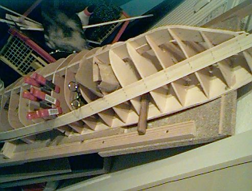 Ein Feuerlöschboot, nach 1:50 Bauplänen von meinem Vater (Schiffsbauingenieur, das ist seine Diplomarbeit!). Leider komme ich nur ab und zu mal zum Leisten kleben. Wenn der Rumpf fertig ist, wird er mit kunstharz versiegelt und mit wenigen Lagen Glasfaser belegt. Die Aufbauten vom ursprünglichen Plan übernehme ich nicht, ich hatte aufgrund des ähnlichen Rumpfschnittes vor, eine "Sirius" von "Tim und Struppi" zu bauen, also ein Fischtrawler auf Schatzsuchfahrt.