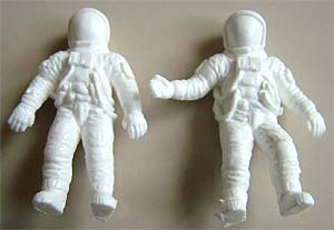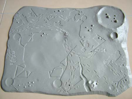 Allerdings : diese Grundplatte hat eine völlig unnötige und überflüssige Eigenschaft : die Schatten sind alle als Vertiefungen in die Oberfläche eingelassen, was jede einigermassen realisitsche Modellierung der Mondoberfläche zunichte macht. entweder man kleckst also die ganze Platte mit 2-Komponentenmasse zu, oder macht die Oberfläche direkt selber aus Gips neu. Ist eh besser, denn die einzelnen Experimente liegen zu dicht beieinander.