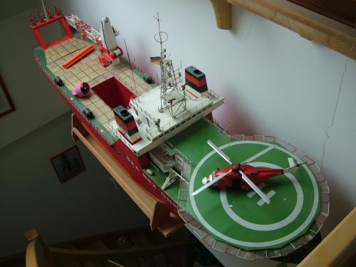 im Massstab 1:75, 145 cm, also ein ziemlicher Kübel. Hab ich vor Jahren mal zusammengezimmert, als der Modellbau so ganz nebenher lief. Jetzt ist es scheußlich beieinander, muss dringend überholt werden. Ich hab zumindest jetzt schon mal diesen häßlichen Hubschrauber weggeschmissen. Dafür steht da jetzt von revell ein 1:72-Hubi. Der Kran kommt wohl auch weg und ein etwas schönerer dafür hin. Auf das Deck wollt ich noch ein paar Tauchboote setzen.